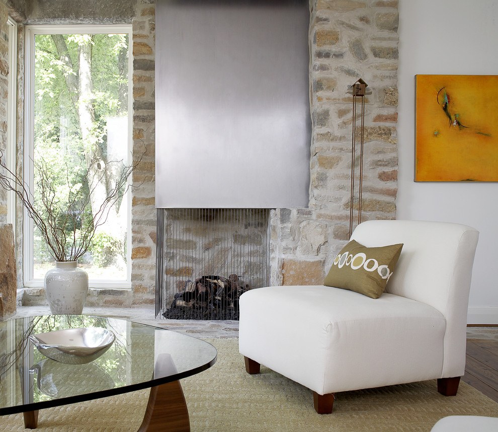 - Кантри. В деревенском стиле интерьера камин смотрится неброско, немного грубовато. Он облицовывается туфом или ракушечником. Обычно над очагом располагают деревянные балки, а рядом с ним — поленницу для дров.