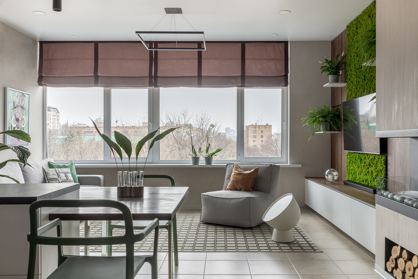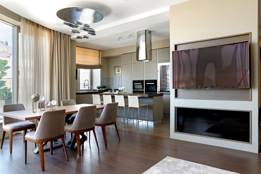 Если телезона и каминный портал не располагаются вместе, но при этом доминирующая функция в гостиной всего одна, — чаще всего смысловым центром становится телевизор. Камин при этом может или играть только декоративную роль, или служить также функциональным элементом (например, помогать в зонировании).