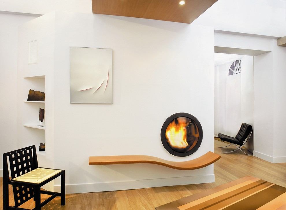 Графические биокамины в интерьерах минималистских пространств, в конструкции которых имеются поленницы – не редкость. Добавить очагу необычности можно, обустроив асимметричный, не имеющий опор портал. Описать словами насколько эффектна получится картинка – сложно. Более наглядно продемонстрируют, как будет выглядеть парящий камин в интерьере фото.