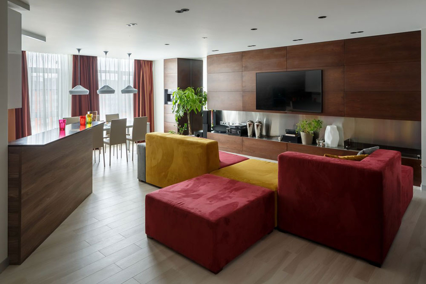 Кинозона и лаунж-зона могут быть и совершенно разными частями гостиной. Такой ход особенно уместен в довольно больших помещениях — и удобен для больших семей. К такому решению также можно обратиться в ситуациях, когда дома часто собираются крупные компании.