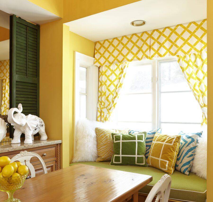 цветовая гамма занавесок должна гармонировать с палитрой, применяемой для декора главных зон помещения. В редких случаях шторы служат акцентом и декорируются в броских тонах: при таком раскладе используйте повторы в ярких акцентах и в других элементах обстановки;