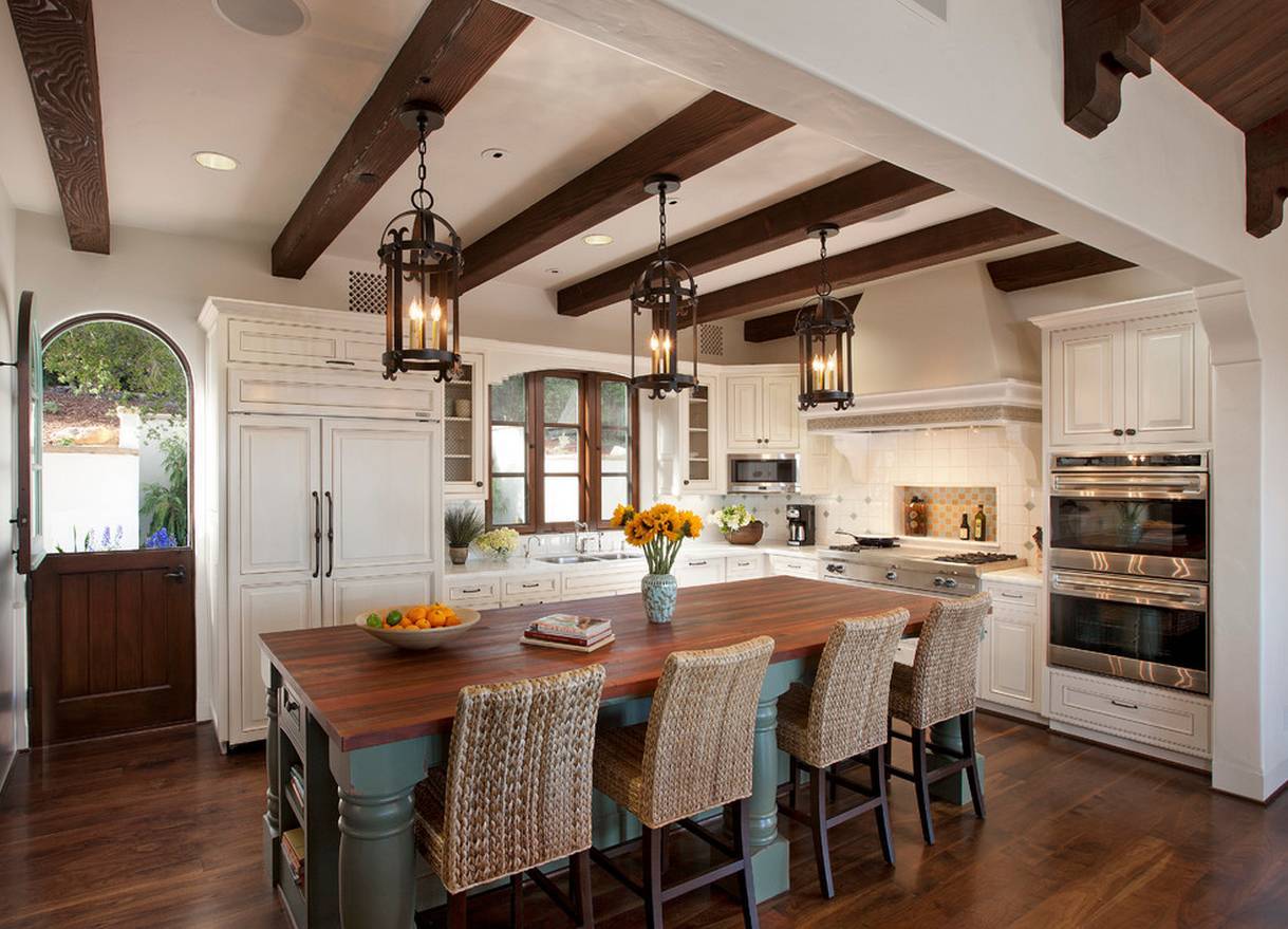 В интерьер кухни отлично впишутся украшения в виде деревянных балочных перекрытий. Оставьте их в исходной гамме или окрасьте в соответствии с палитрой кухни. Если высота потолков позволяет, располагайте балки так, чтобы образовалась конструкция со скосом.