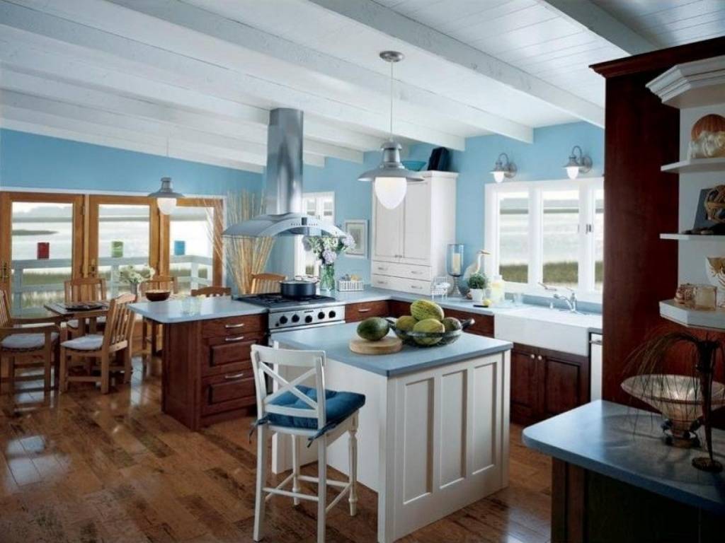 Попробуйте оформить кухонное помещение в «морских» оттенках. Для такого интерьера подойдет бирюза, лаванда, мята, цвет морской волны, голубой и синий. Для расстановки акцентов используйте оливковый и оттенок кофейных зерен, подберите бронзовые и позолоченные вставки.
