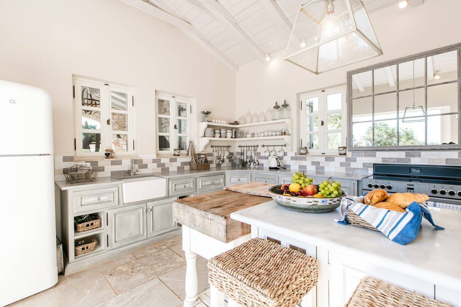 Белый, коричневый и зеленый цвета в греческом интерьере кухни