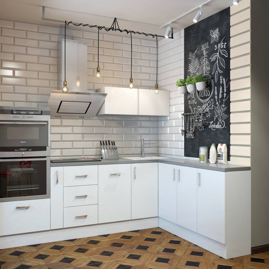 Отдайте предпочтение пастельным оттенкам. А вот обеденную зону можно выделить — синий, терракотовый, бирюзовый. Материал для нее используйте тот же, что и для остальной кухни или поищите комбинированный вариант — порой такие решения смотрятся очень выигрышно.