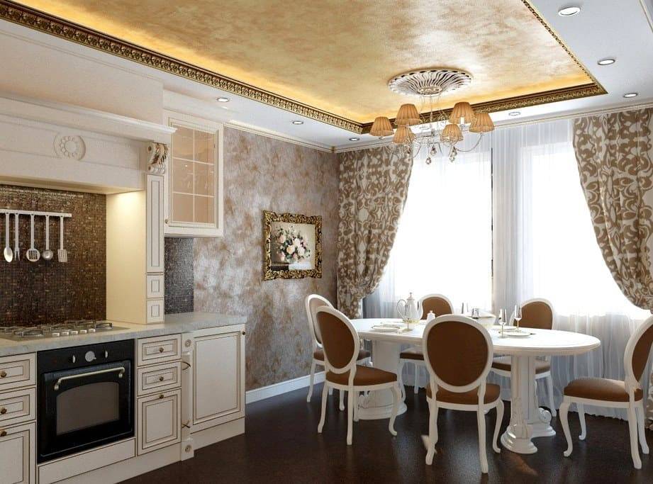 В потолок могут упираться величественные колонны, декорированные лепниной. При наличии такой возможности в поверхности потолка делают окошко для лучшей освещенности комнаты.