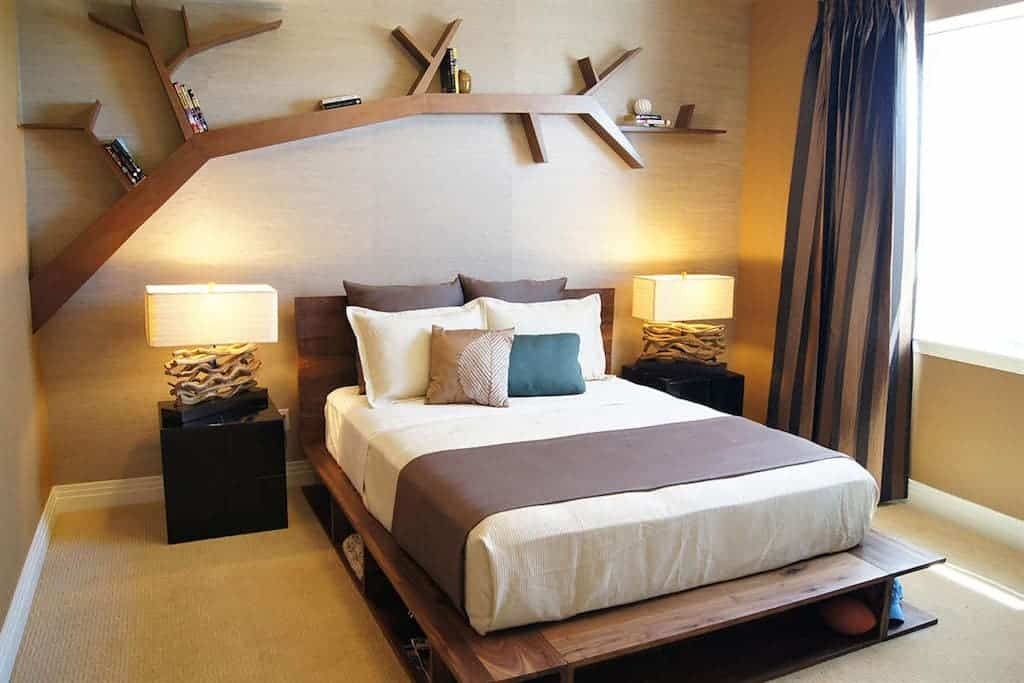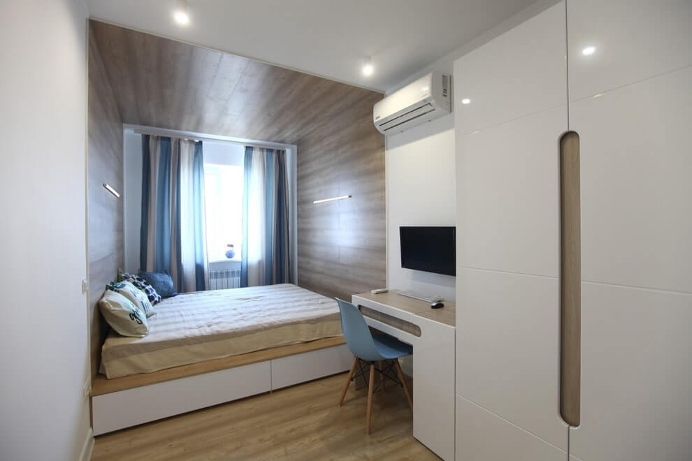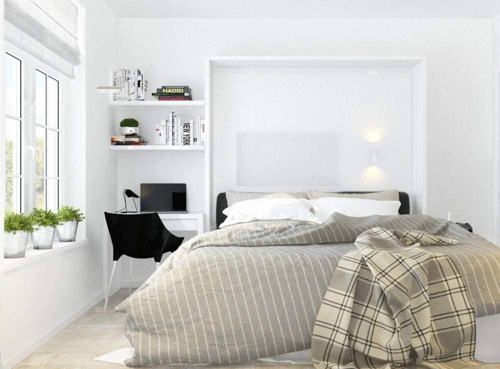Этот вариант — отличный дизайн для маленьких спален, так как он позволяет делать пространство уютным и сохранять при этом выдержанность традиций минимализма.