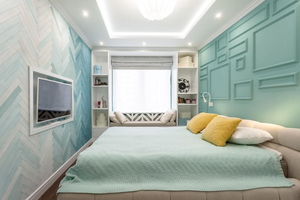 Спальня 12 квадратных метров довольно маленькая, поэтому если вам нужен телевизор — повесьте его на стену напротив спального места, избегая установки дополнительных консолей.
