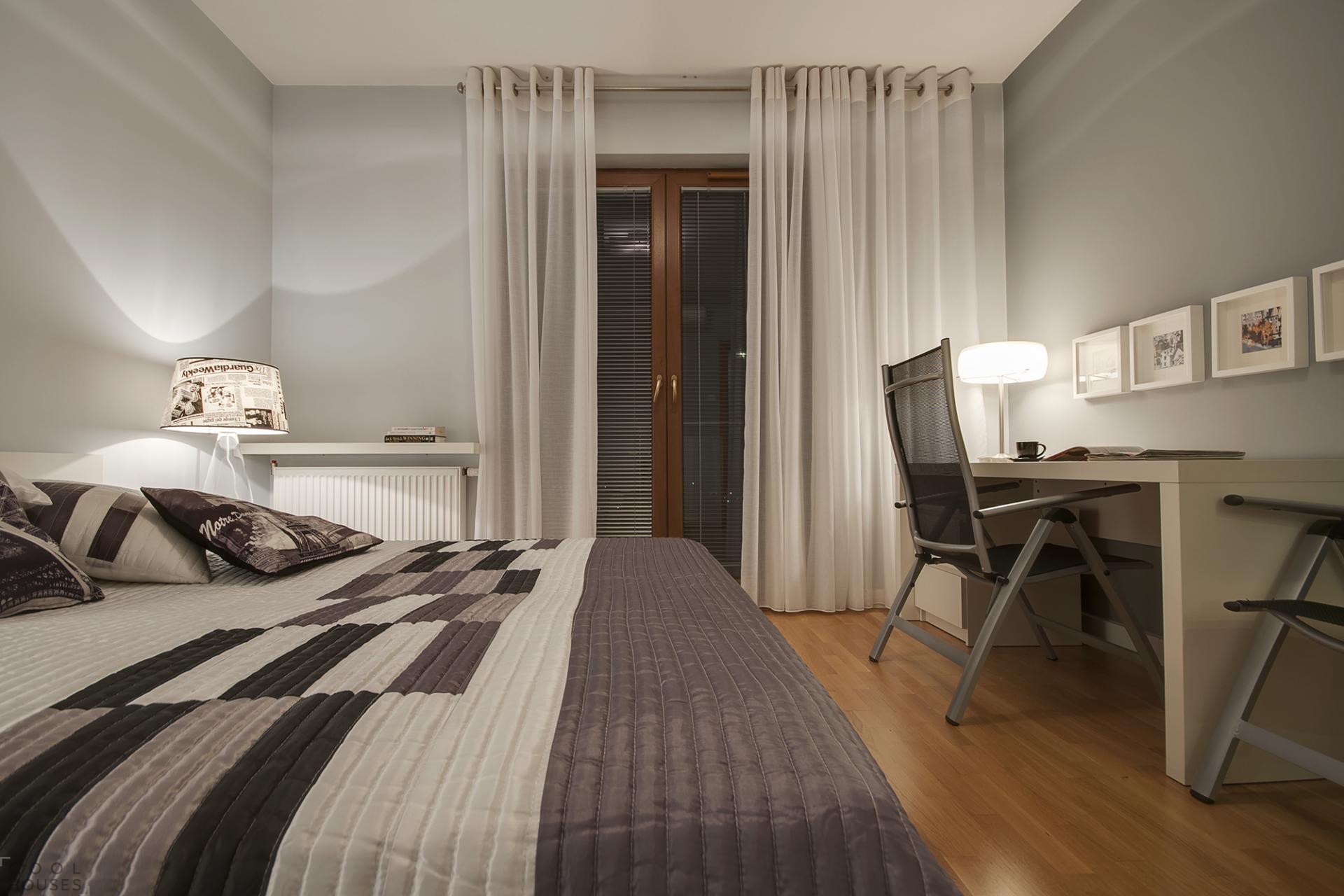 Картины и торшер как аксессуары небольшой спальни