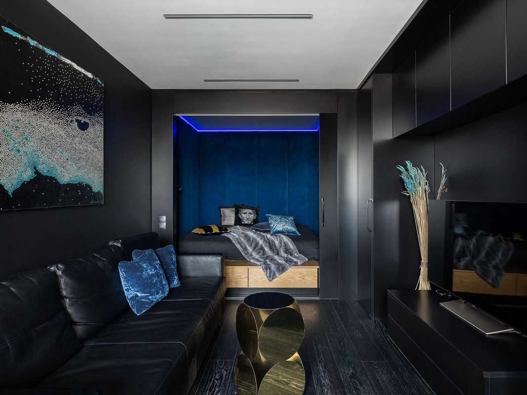 Дизайнер Ксения Мицкевич, разрабатывая проект гостиной, совмещённой со спальней, специально никак не стала выделять место для сна. Наоборот, вся комната выполнена в единой тёмной цветовой гамме, вдоль стены расположился большой шкаф, который соединяет весь интерьер комнаты в единое целое. Хотя кровать находится на подиуме и приподнята над уровнем пола, нельзя сказать, что тут вообще нет никакого деления. Квартира настолько маленькая, что роль гостевой зоны здесь выполняет только кресло с телевизором, для дивана места уже не осталось.