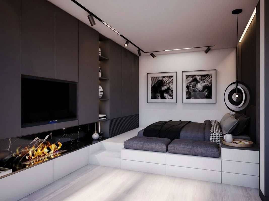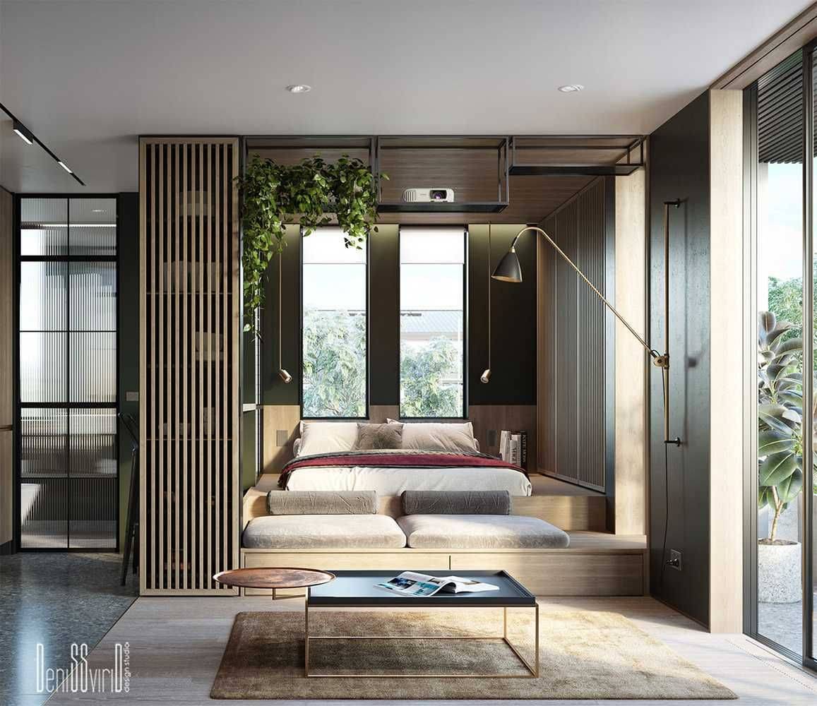 Гостевая и спальная зоны находятся друг напротив друга, но диван в комнате отсутствует. У подиума-кровати были предусмотрены места для отдыха. Получилось, что кровать образует сложную мебельную конструкцию для сна и отдыха. Телевизора в комнате нет, его заменяет проектор с экраном, который выдвигается при необходимости. Подобную планировку удастся реализовать только в комнате вытянутой формы