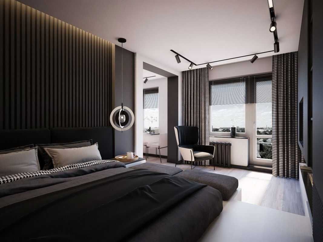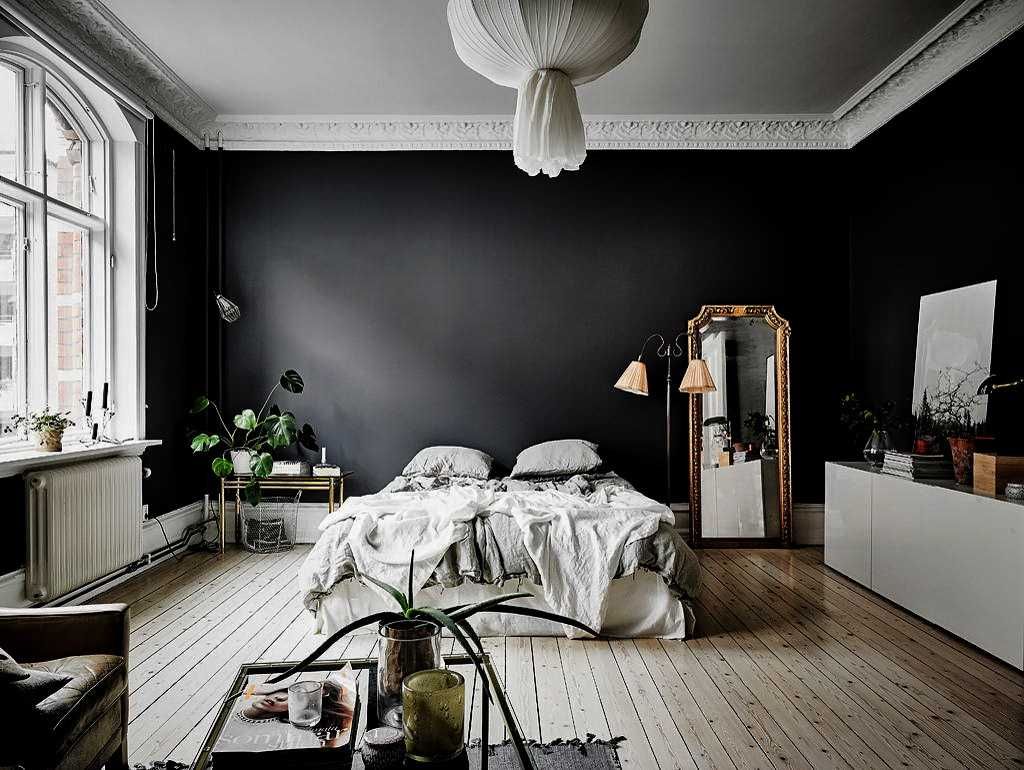Интерьер комнаты в скандинавском стиле отличается простотой, как и любые другие проекты в этом стиле. Объединяющую роль выполняют чёрные стены, которые играют роль общего фона для комнаты. Диван и кровать просто установлены рядом и не имеют никаких разделителей.