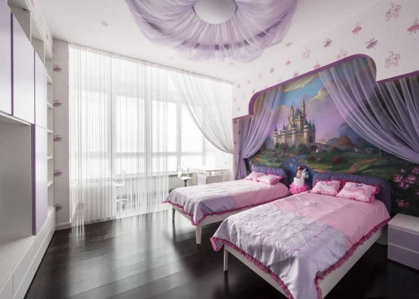 В большой комнате можно провести зонирование за счет игры контрастов. К примеру, в серо-сиреневом цвете оформить зону сна, а территорию, где прихорашивается мама или работает папа, задрапировать в сиреневых оттенках, в сочетании с тоном из гаммы фуксия.