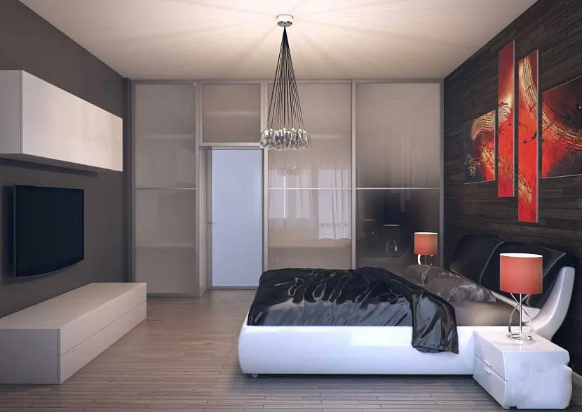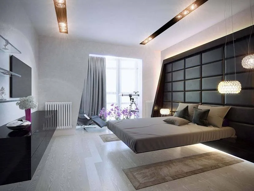 Спальни в стиле хайтек, фото-пример как разбавить монохромный интерьер неброскими акцентами