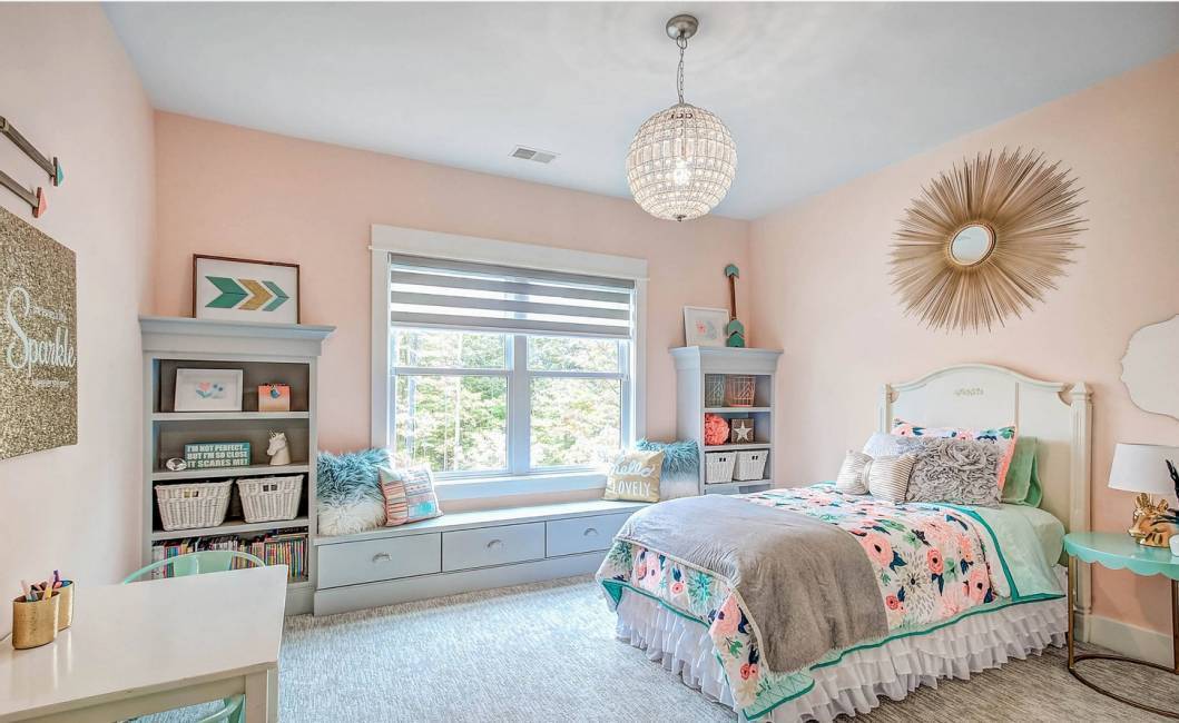 Нежный интерьер больше подходит для оформления детской комнаты для девочки. Цветы, мягкая палитра, комбинация тканей разного цвета и фактуры будут напоминать кукольный домик или комнату принцессы. Куклы и игрушки будут сливаться с общим стилем, и выглядеть как одно целое.