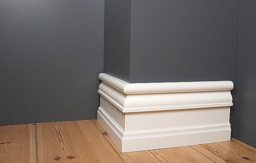 - Пенопластовые (полиуретановые) – они идеальны для последующей окраски. Подбирать их в тон для стен или пола нет необходимости. Однако, главным минусом является их чрезмерная хрупкость, т.ч. при эксплуатации нужно быть максимально осторожным. Монтаж возможен и на клей и на саморезы.