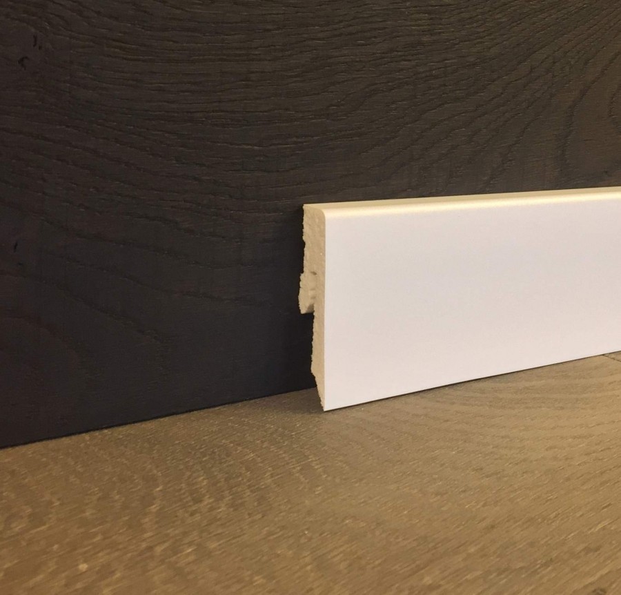 Эти изделия состоят из спрессованной древесной стружки, а их декоративный слой — из пропитанной красителями бумаги и защитного покрытия. Они удобны тем, что не крошатся при монтаже. Монтаж плинтуса из МДФ осуществляется с помощью клипс, саморезов или монтажного клея.