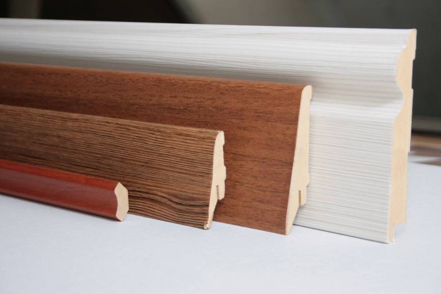 - Изделия из МДФ или ХДФ – данные синтетические материалы различаются между собой лишь плотностью. Изготовление происходит следующим образом: из расплавленной массы создается планка, на которую наносят ламинирующий слой ПВХ или шпона. Данные отделочные элементы следует устанавливать, если пол покрыт линолеумом или уложен ламинат «под дерево». Цвет плинтуса должен подходить под тон покрытия. Эти же изделия можно приспособить для обналички дверных проемов из-за легкости их монтажа.
