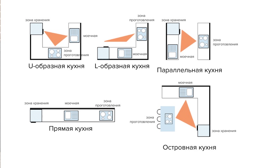 На кухне должны быть предусмотрены три основные рабочие зоны: участки приготовления еды (плита), хранения продуктов (холодильная камера) и место для мытья продуктов и посуды (раковина). Они составляют своеобразный треугольник (если соединить все точки линиями). Уже практически столетие назад был разработан принцип его устройства. Площадь треугольника не должна превышать 5-7 кв.м. (даже в просторных кухнях). Расстояние же между рабочими зонами может варьироваться в пределах 1,2-2,7 м.