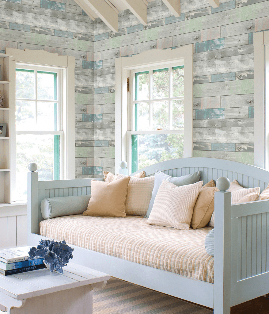 Еще один вариант – использовать при оформлении интерьера не старые доски, а их имитацию в виде обоев, плитки и пр. Современные производители предлагают настолько реалистичные товары, что только на ощупь можно определить, что это «подделка».