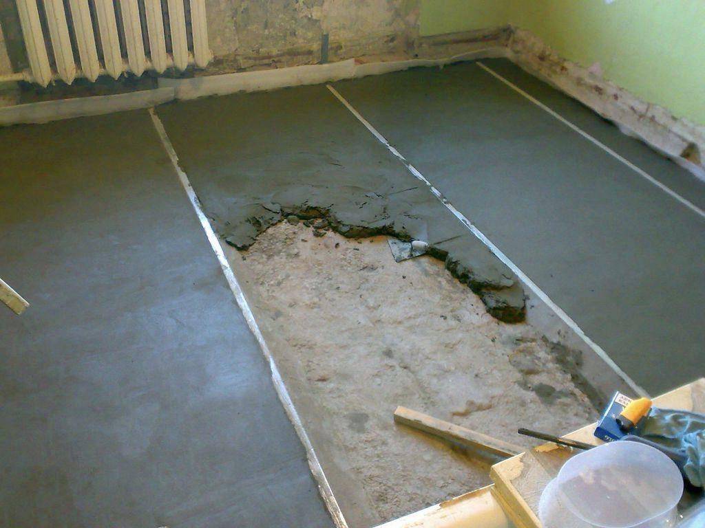 Как обычно, монтажные работы начинаются с подготовки. Для того, чтобы пол имел одинаковую прочность и нагрузочную способность, его основание должно быть однородным. Так, если имеется старая стяжка, частично разрушенная, ее необходимо демонтировать полностью. При этом удаляются все фрагменты, даже сохранившие целостность. То же касается частично поврежденной засыпки.