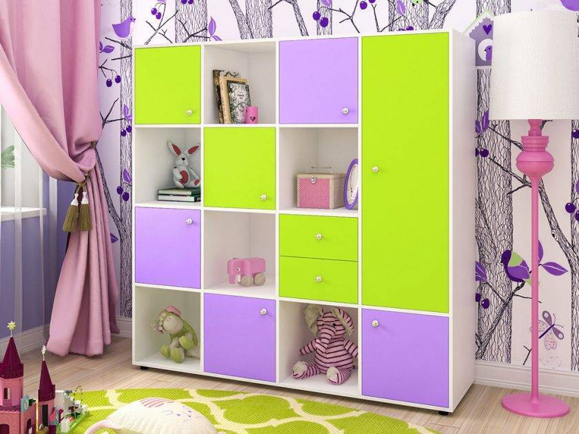 Самым оптимальным вариантом станут модульные конструкции, состоящие из отдельных квадратных или прямоугольных отделений разных размеров и цветов.