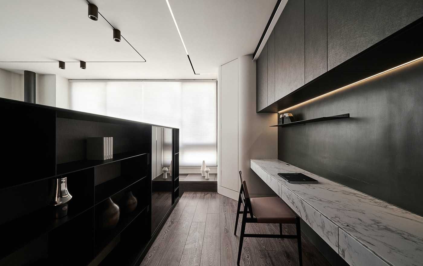 Не самый простой пример зонирования. Маленький односторонний стеллаж закрыт дополнительной низкой перегородкой с телевизором. Вся эта конструкция отделяет рабочую зону в гостиной.