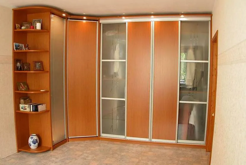 Устанавливается в углах гостиной. Конструкция может иметь различные формы: выпуклую, вогнутую, полукруг, трапециевидную, волнообразную. Используется только в больших помещениях. В сочетании с зеркальными фасадами, способны визуально увеличивать площадь комнаты.