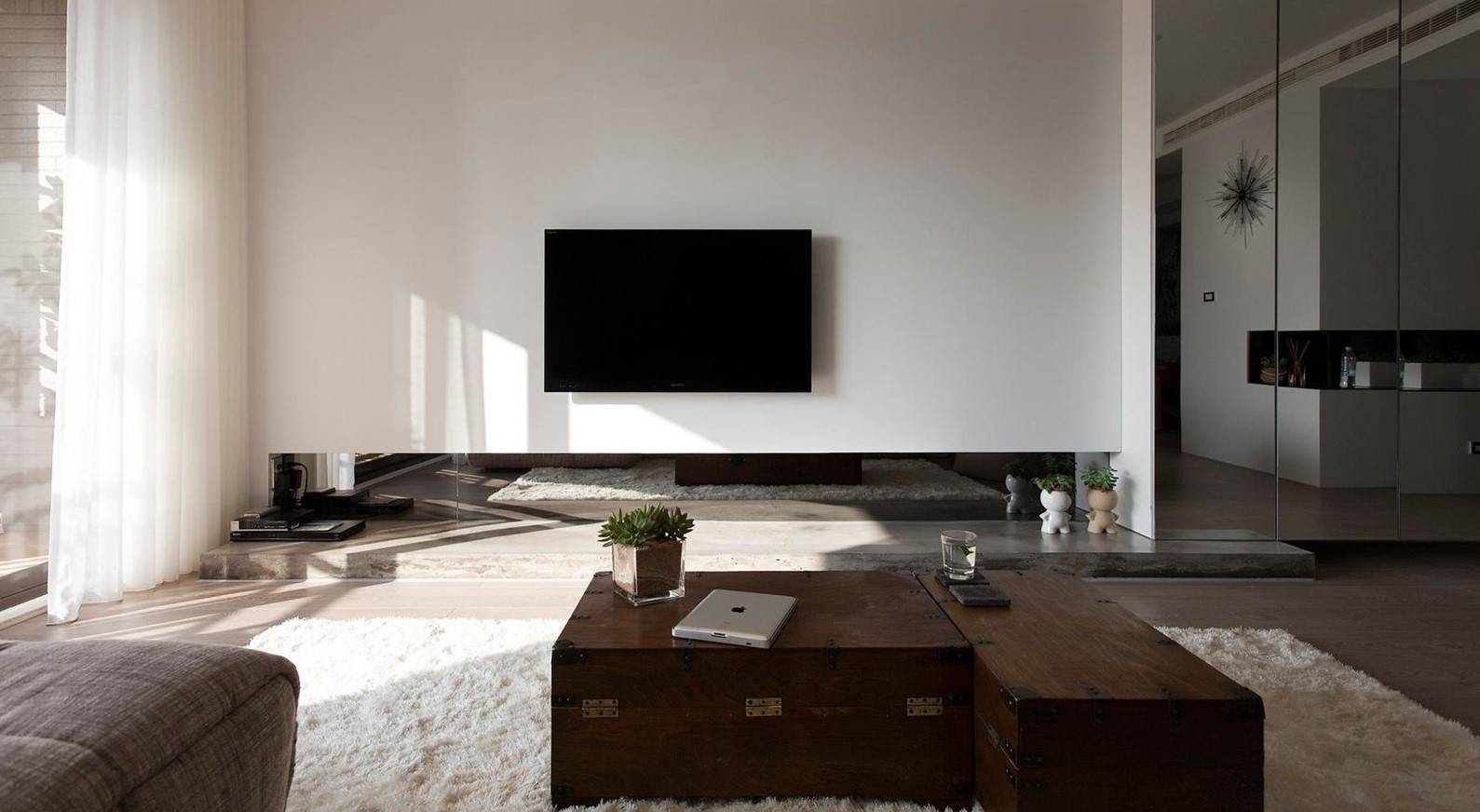 Минимальное наполнение комнаты является самым популярным направлением в современном исполнении. Цвета выбираются белые, черные, серые, бежевые. Стенка должна быть не броская, четко вписываться в общий интерьер. Основная часть мебельной конструкции должна быть закрыта от посторонних глаз.
