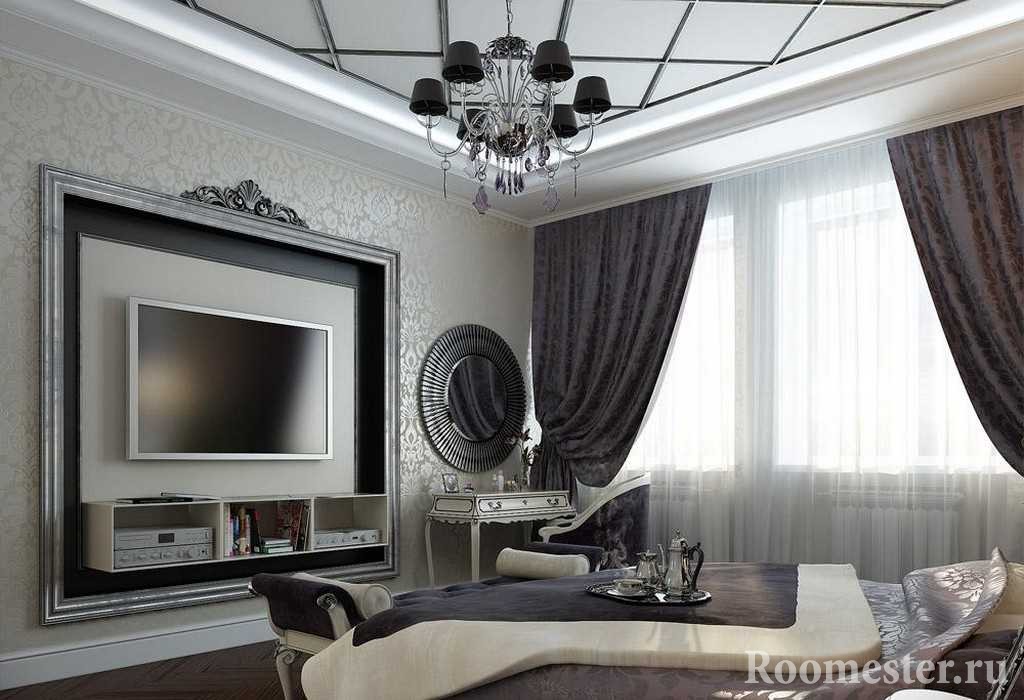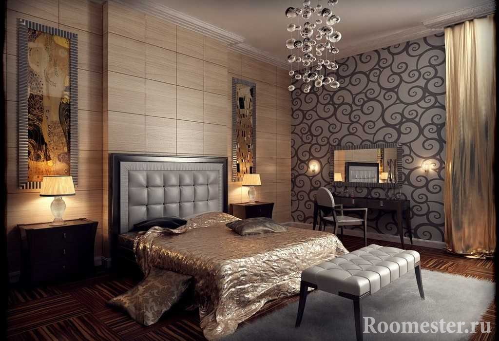 Перед кроватью должна поселиться натуральная шкура или коврик из длинноворсного меха с густым подшерстком. Сама кровать застилается роскошным покрывалом, расцветка подушек сочетается с тоном обивки пуфика, кресла. Обивка должна быть контрастной по отношению к стенам и потолку. Наряду с центральной хрустальной люстрой обязательно наличие дополнительных ламп, торшеров, светодиодной подсветки.