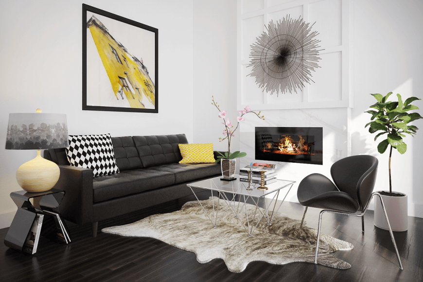 - в гостиной в таком дизайне должны быть различные источники света и зонированное освещение;