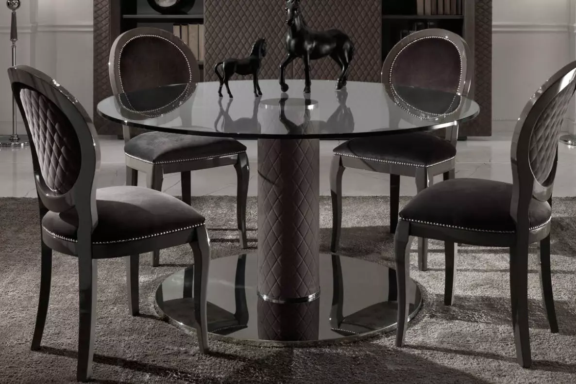 Интерьер обставляют всевозможными буфетами с дверцами из стекла, изящными столами, тумбами или комодами использующимися в качестве систем хранения. В обивке дивана, кресел или стульев встречается бархатный, велюровый, кожаный, замшевый материал или мех с коротким ворсом.