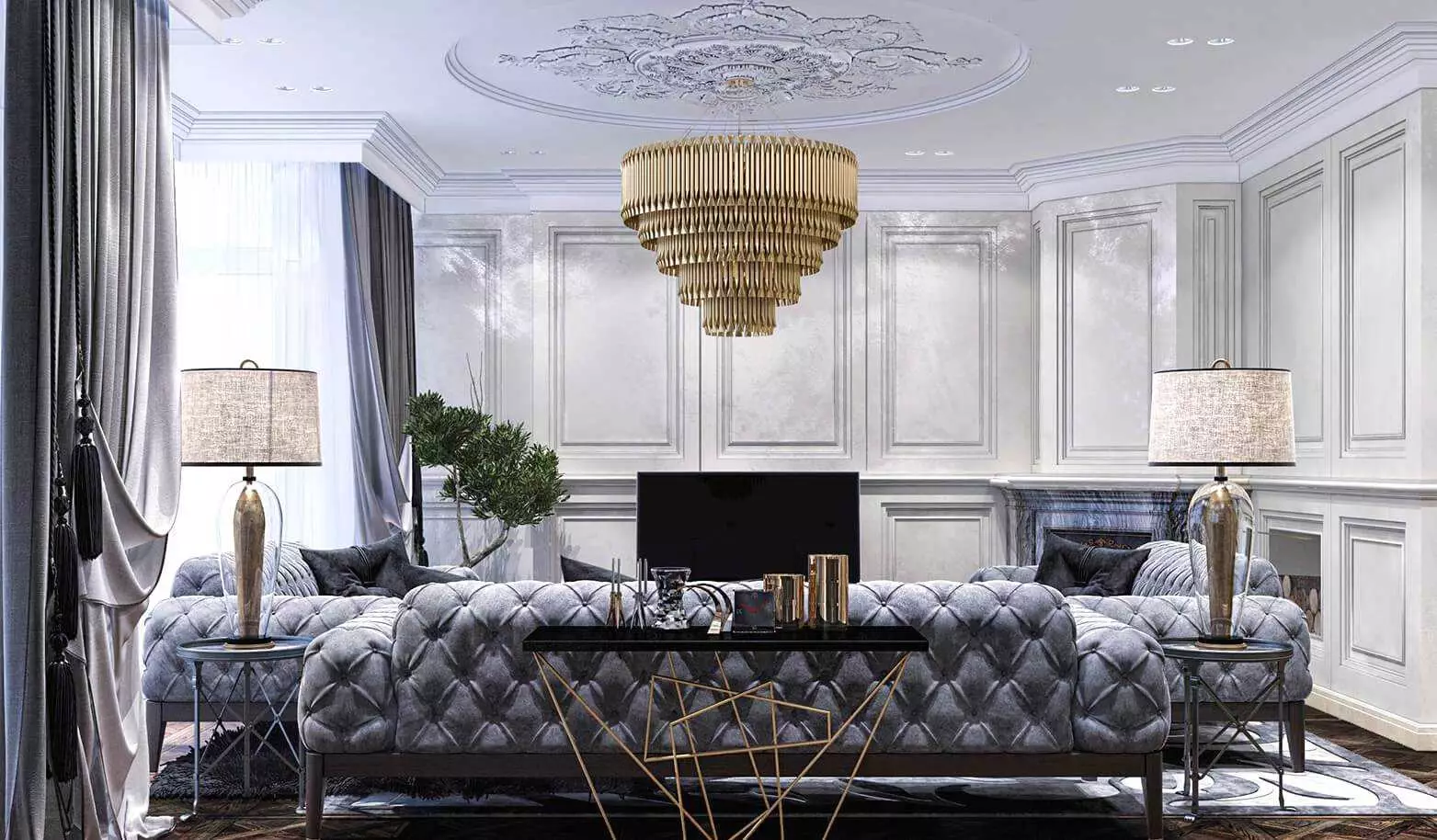 Отделка гостиной в стиле неоклассика не терпит дешёвых материалов