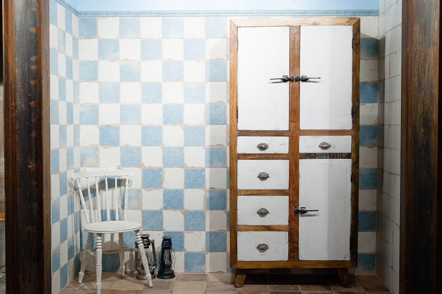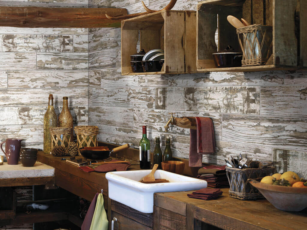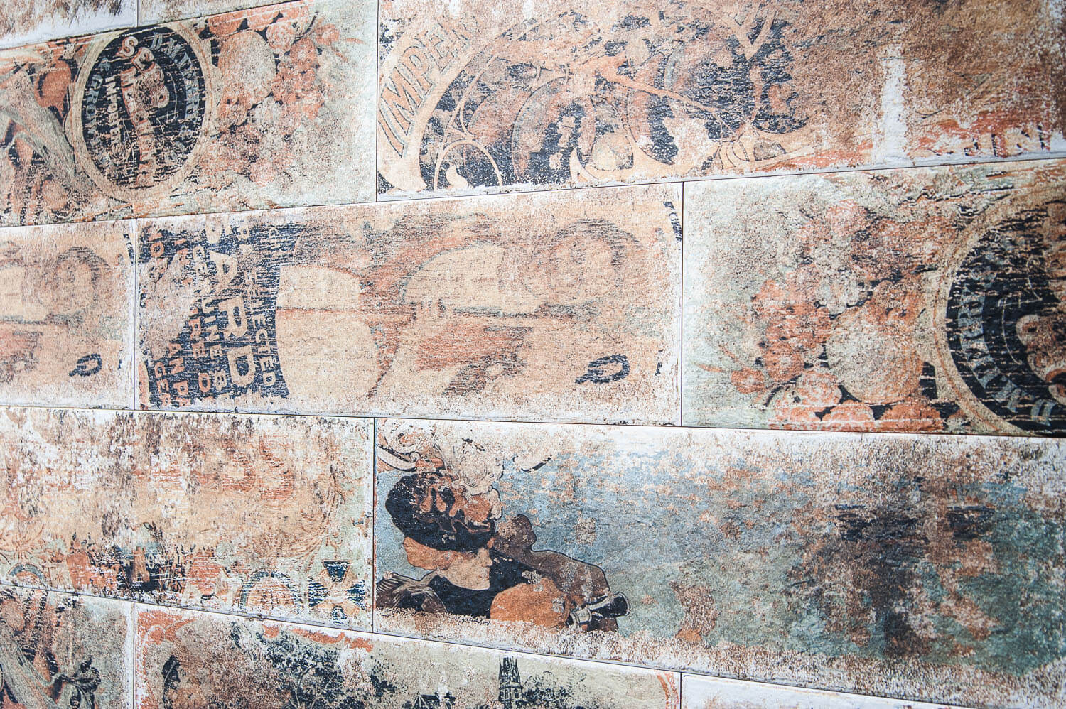 Для декорирования стен есть три решения: покраска, обои и керамическая плитка. По дизайну настенная плитка в стиле Винтаж – это преимущественно пэчворк, имитация штукатурки, вариации «дерева» (потертое, с трещинами, со следами старой краски и т.д.).
