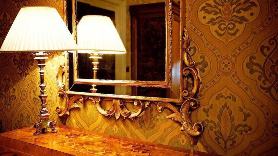 Свет должен быть не очень ярким и теплым. Для этого используются торшеры в тканевых абажурах, хрустальные люстры, а также разнообразные металлические лампы и подсвечники.