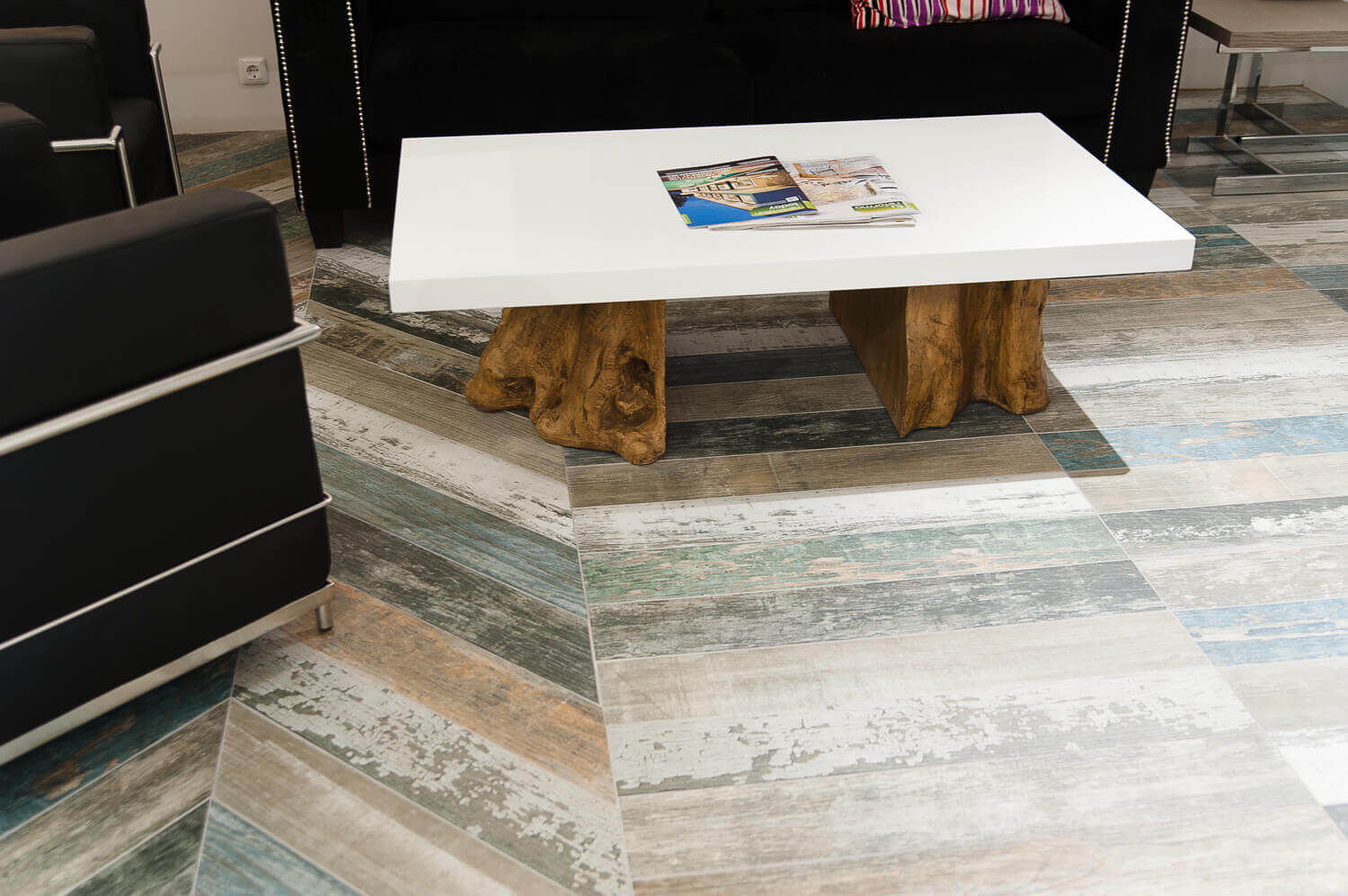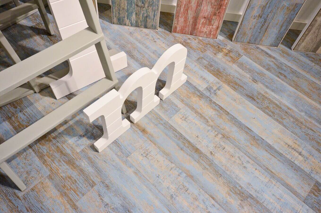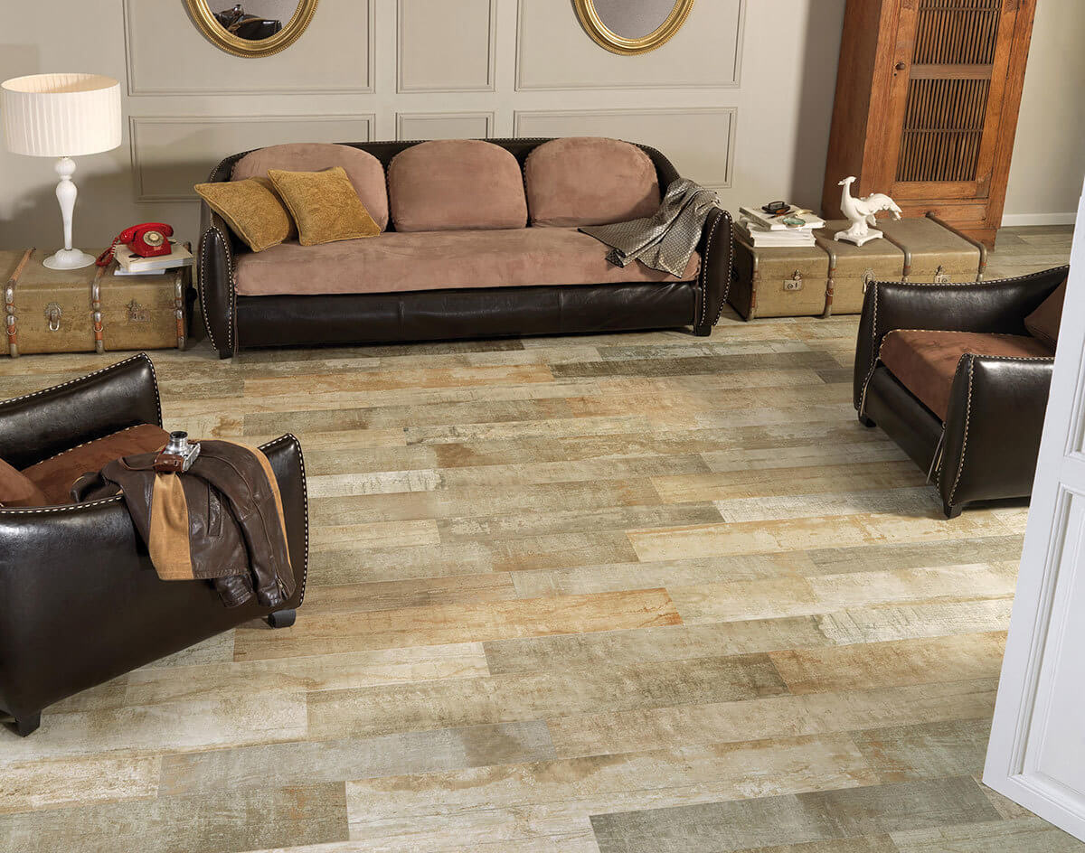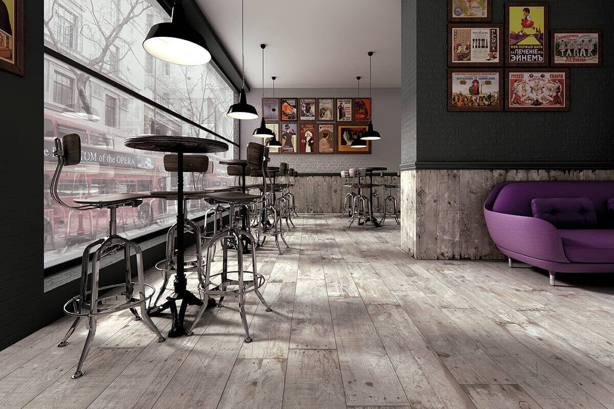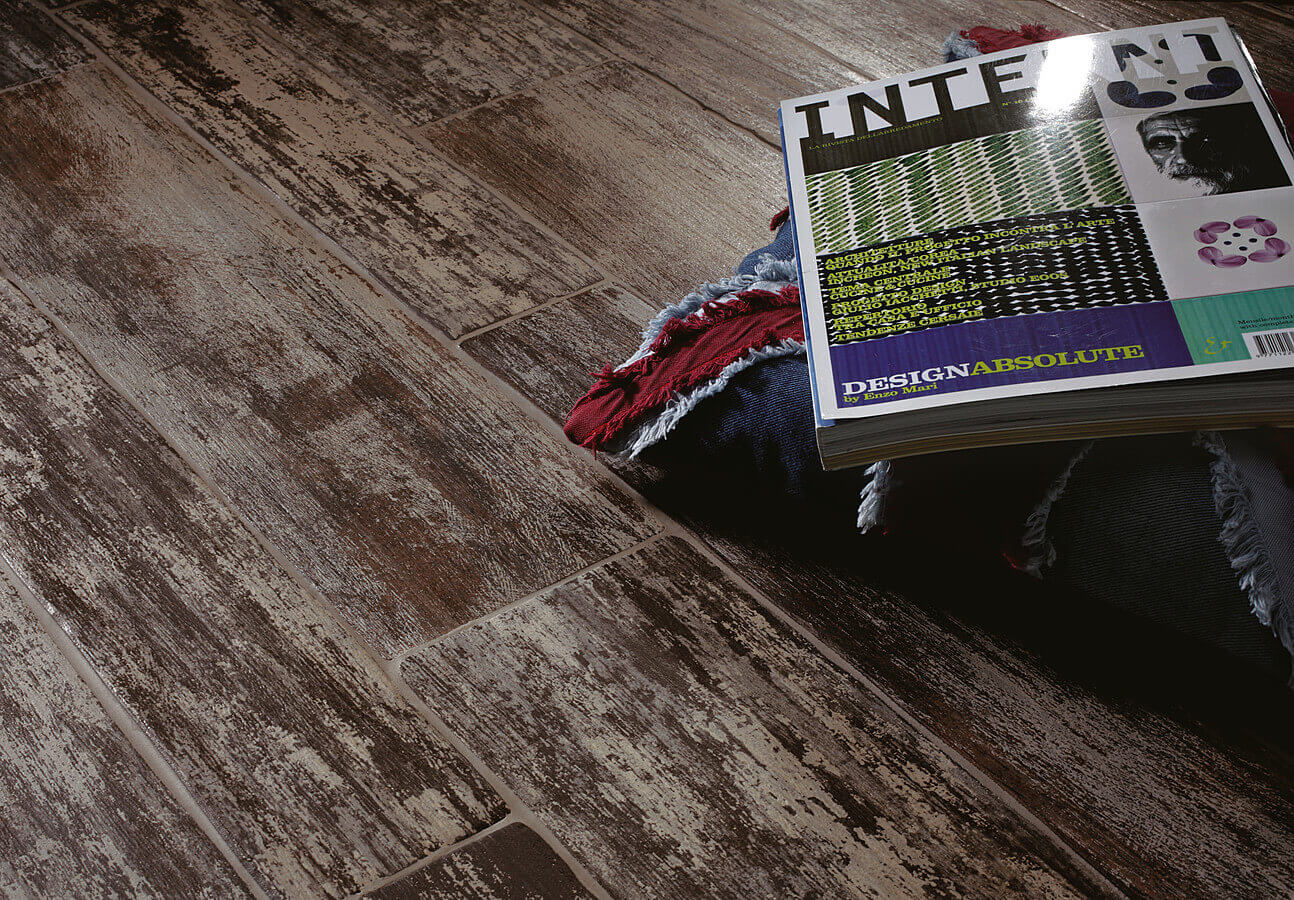 Для оформления полов – натуральный паркет или же керамическая плитка с имитацией состаренного, истершегося дерева. Второй вариант даже интереснее: многие фабрики выпускают великолепные коллекции в винтажной стилистике, которые визуально и тактильно фактически неотличимы от натурального дерева. К тому же, выбрав керамическую плитку, можно обыграть не только фактуру, но и цвет «дерева».