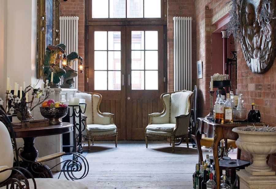 В интерьере можно использовать мебель разных стилей: высокие шкафы с резным декором, комоды и сундуки, серванты, старинные зеркала, кованные кушетки, массивные деревянные кровати, венские стулья, полки с ажурными прорезями, грубые деревянные столы, ретро-мебель. Главное, чтобы они сохраняли следы времени: царапины, трещинки, облупившаяся местами краска, потертости и пр.