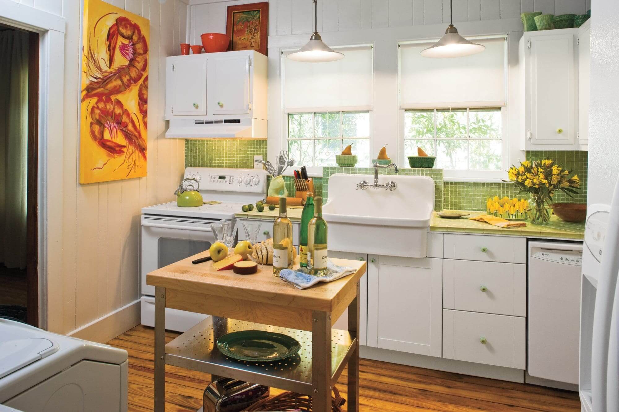 Здесь главное соблюдать простоватость и с большим вниманием относиться к предметам декора, которых должно быть много. Стена в зоне для приготовления пищи оформляется мелкоформатной плиткой