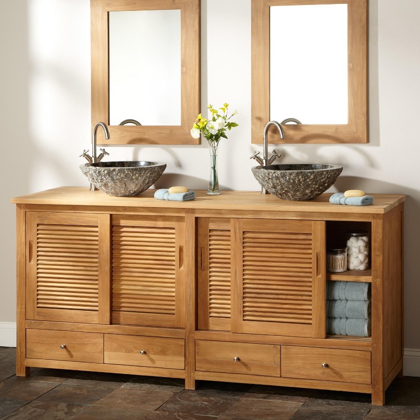 При использовании деревянной модели в ванной, следует подбирать смеситель – вода, из которого не разбрызгивается, чтобы избежать следов от капель. Вариации из бамбука – высокопрочная альтернатива традиционной древесине