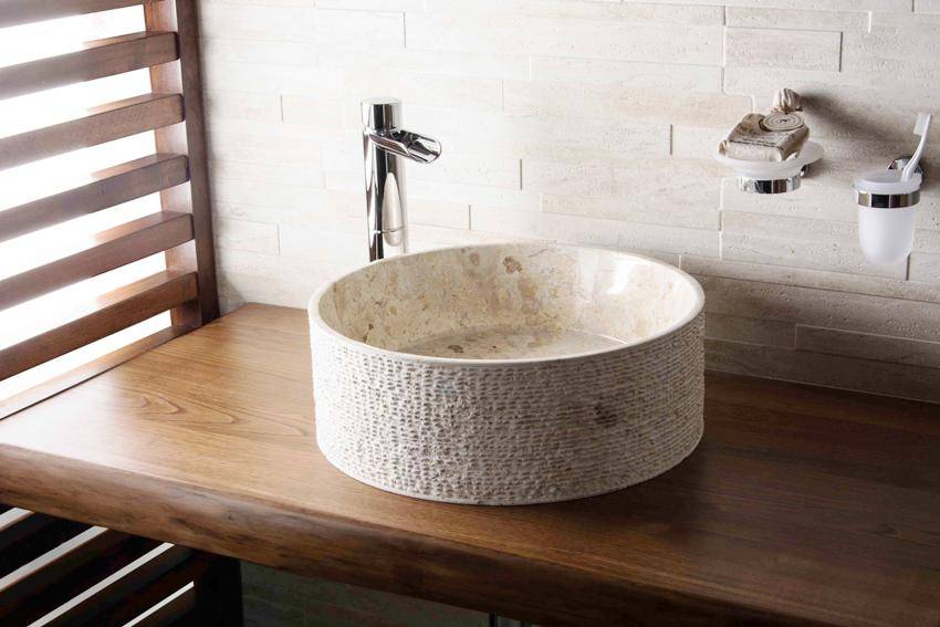 Похожие по внешним характеристикам материалы являются разными по своей природе. Модели на основе натурального камня имеют толщину в несколько сантиметров и обладают отверстиями для установки сантехнических приспособлений. Дорогостоящий и долговечный натуральный камень выглядит очень привлекательно, но относится к оптимальным вариантам для установки только в просторных помещениях.