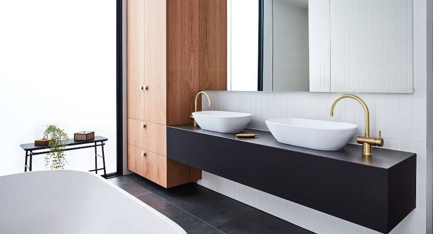 Большие ванные комнаты тоже выиграют от такого рода мебели. Но здесь есть возможность установить длинную столешницу – от стены до стены, и под одной поверхностью собрать не только стиральную машину и умывальник, но и полки, ниши, разного рода ящики. У конструкции есть и другие преимущества: