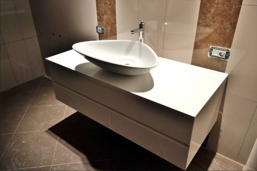 При уходе за ними нельзя применять только те моющие средства, которые в своём составе содержат абразивы. Поэтому искусственная столешница в ванную — довольно практичное решение.