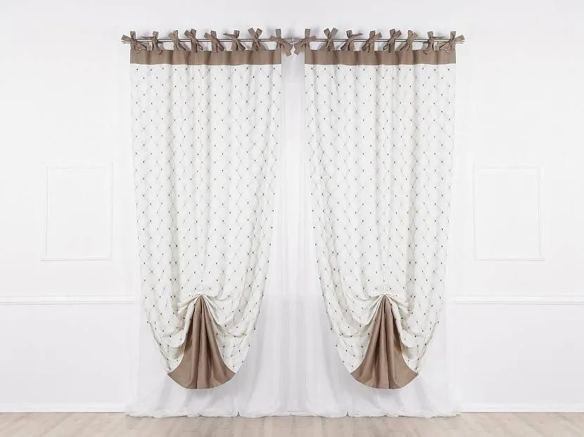 Классические шторы на завязках выглядят оригинально и разнообразно за счет разного способа завязывания (банты и разные виды узлов). Кроме того, цвет завязок может отличаться от цвета гардин.