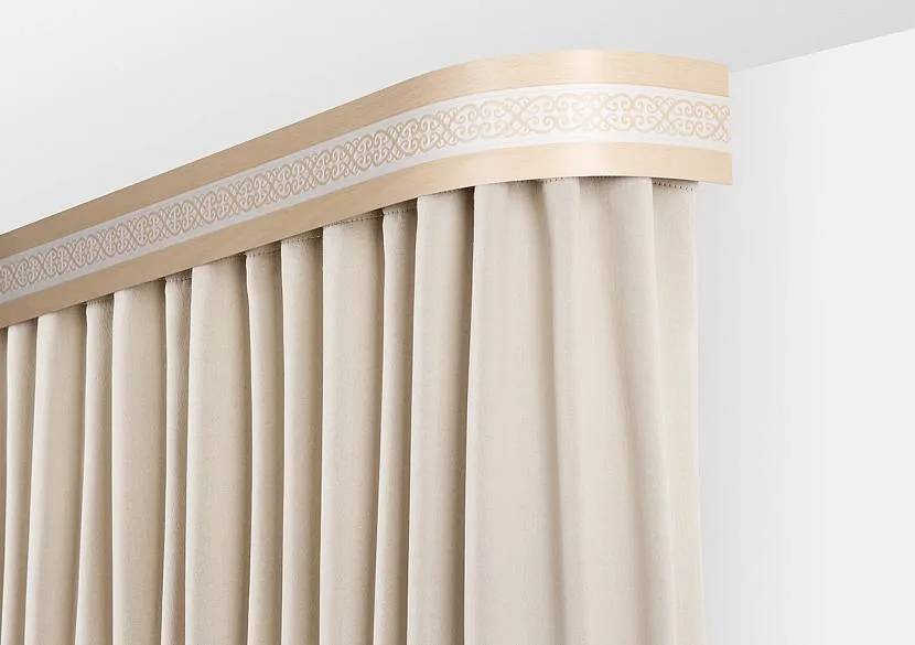 Деревянные карнизы могут быть потолочными, настенными, трубчатыми и багетными. Натуральный оттенок дерева впишется в классический интерьер любой комнаты.