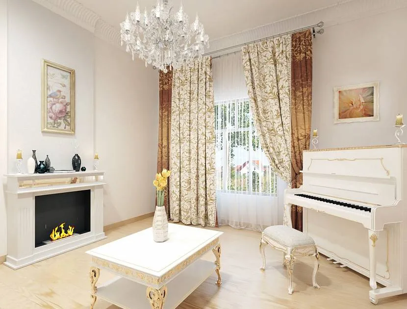 Для гостиной в классическом стиле подойдут также французские шторы. Они, может чересчур парадные и не совсем практичные, но смотрятся шикарно и придают некую романтичность.