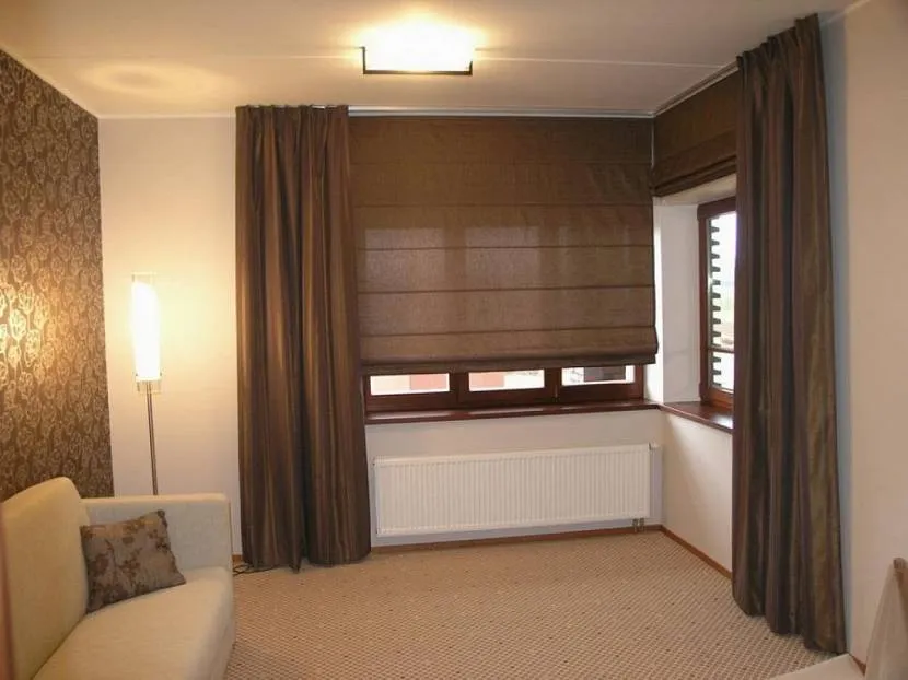 Интересны комбинации двух типов штор. Например, японских и классики, причем в обоих вариациях. На первом фото — оформление панорамного окна в гостиной. Гардины — японского типа, из легкой прозрачной вуали белого цвета, портьеры классического дизайна из плотной коричневой ткани.