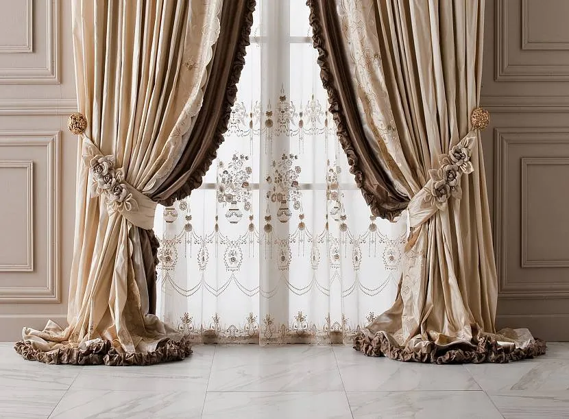 Признаками классических штор является наличие тюли, раздвижные портьеры с прихватом или без, плотный материал ткани, длинные полотна, изящность складок.