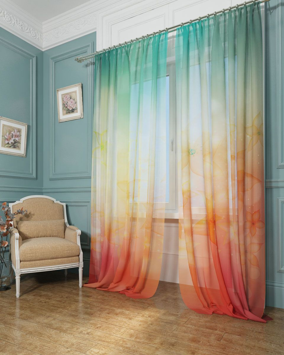 Занавески с градиентным переходом цвета от светлого к темному оттенку, смотрятся необычно и изыскано. Так же в текстильной промышленности встречается эффект омбре, разные цвета которого плавно перетекают из одного в другой.