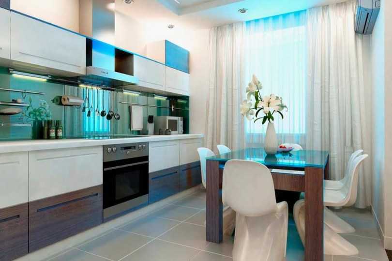 Кухня довольно редко бывает действительно больших размеров, а ввиду того, что модерн предполагает большое обилие драпировки рекомендуется отдавать предпочтение легким, полупрозрачным, воздушным тканям.