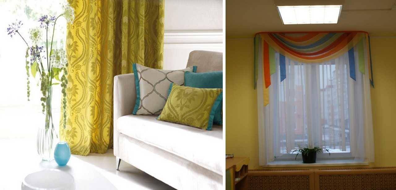 Если же окна традиционно расположены на расстоянии друг от друга – тогда полотна навешиваются с объемной драпировкой или скомбинировано с рулонными занавесками.